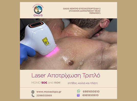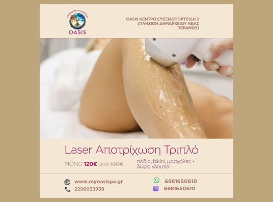 Τριπλό Laser Αποτρίχωσης Νέας Γενιάς *Ισχύει για περιορισμένο αριθμό ραντεβού* Η πιο σύγχρονη και αποτελεσματική λύση για μόνιμη αποτρίχωση είναι εδώ - με προνομιακή τιμή. Τριπλό Πακέτο: Πόδια, Μπικίνι, Μασχάλες**ΔΩΡΟ ΓΛΟΥΤΟΙ* 120€