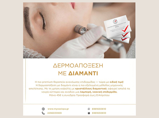 Δερμοαπόξεση στο Oasis – Ανανεώστε την επιδερμίδα σας πριν την Άνοιξη! Η περίοδος που διανύουμε είναι ιδανική για δερμοαπόξεση, μια θεραπεία που χαρίζει βαθιά ανανέωση και λάμψη στο δέρμα σας πριν ξεκινήσει η έντονη ηλιοφάνεια. 45€